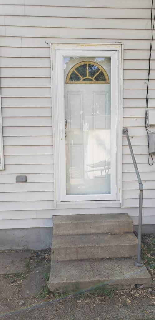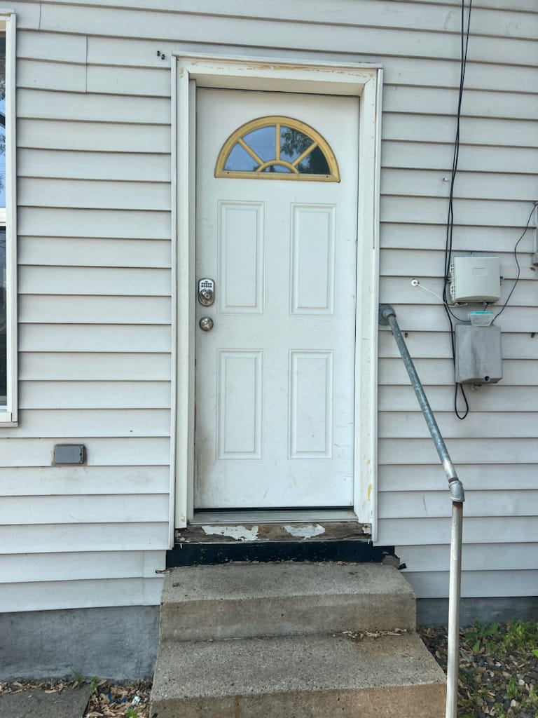 Before and after photos of a recent job: adding a new door to the back entrance and repairing the siding along the threshold.